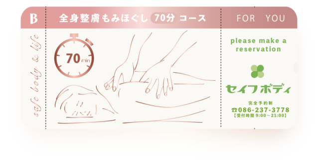 気になる症状がある方におススメです。 頭の先から足の先まで全身ほぐします。 手・肩・背中・足・足裏はもちろん、お顔やお尻まで、全身をほぐします。 そして、気になる部分を多めにしっかりとほぐします。 ご予約時にwebチケット購入のこと・購入時のお名前をお知らせください。 尚、キャンペーン・割引サービスが反映されません。 キャンペーン・割引サービスをご利用の方は現地決済をご利用ください。
